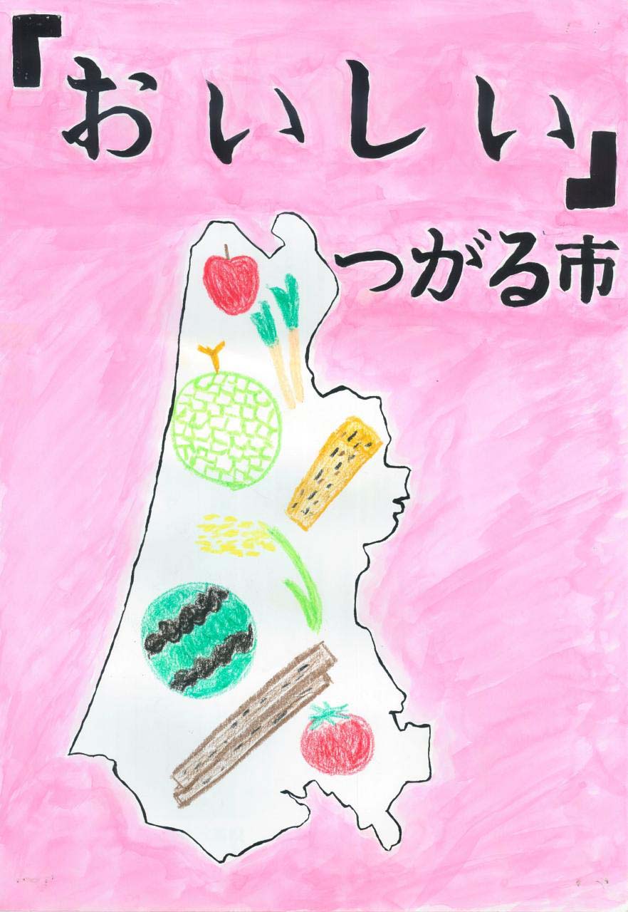 つがる市にある特産物を中心に描きました。私の知っているつがる市の食べ物や馬、土偶を大きく紙、全体に描くように心がけました。